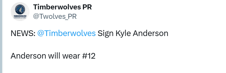 据悉,李凯尔将身披12号球衣。这样一来,李凯尔成为森林狼队史上第一位穿过三个不同球衣号码的球员:5号(2022-23赛季)、1号(2023-24赛季)和现在的12号。